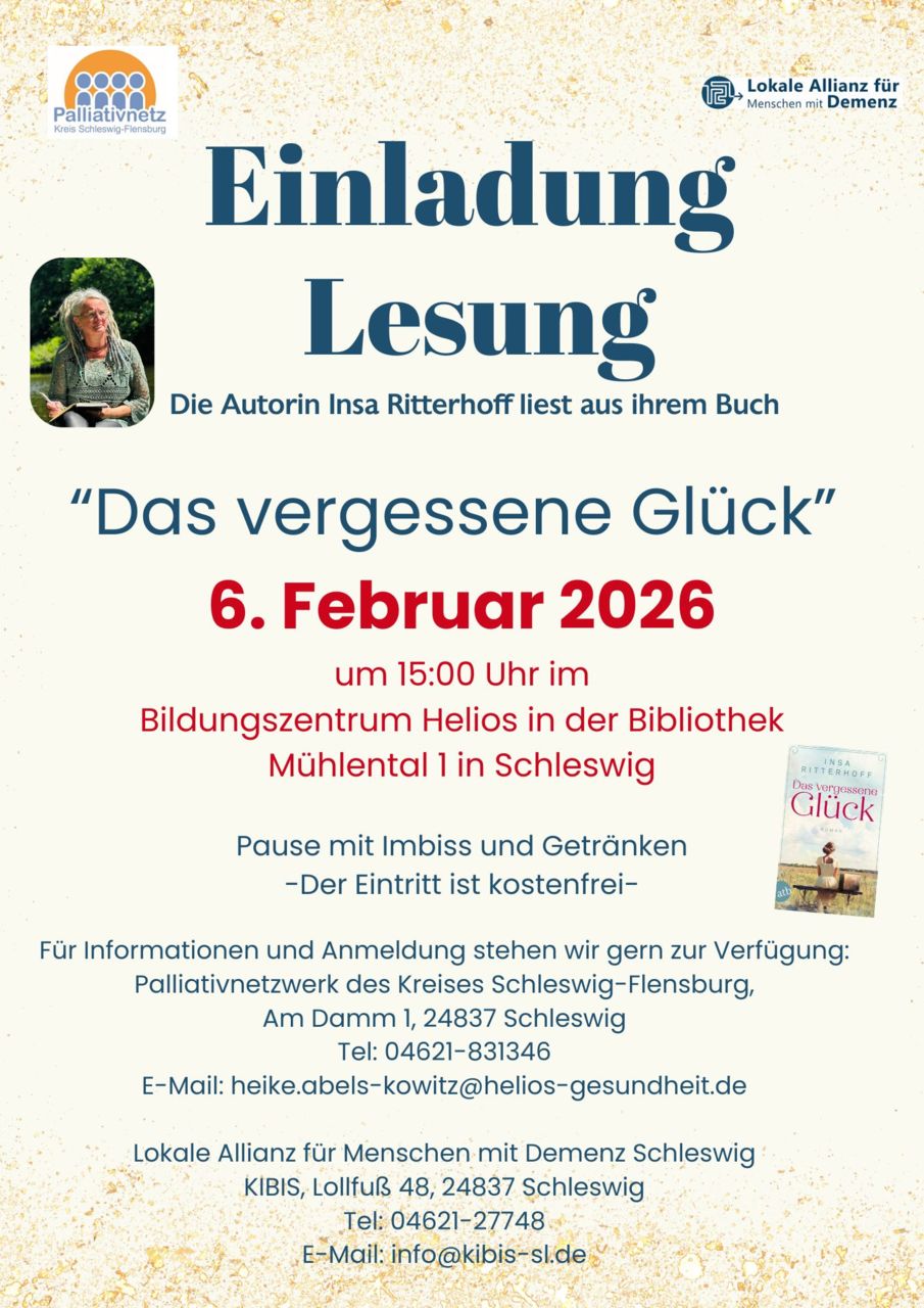 Wir laden Sie zu einer kostenfreien Lesung ein. Die Autorin Insa Ritterhoff liest aus ihrem Buch "Das vergessene Glück" in der Bibliothek Helios, Mühlental 1, Schleswig.